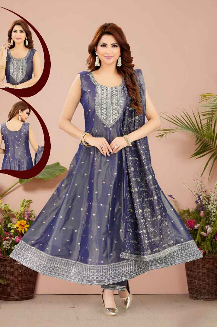 Make a dazzling statement in this elegant navy blue sleeveless Anarkali set. Crafted in a glossy silk blend, the outfit features heavy embroidery on the neckline and border, paired with a coordinated dupatta and pants. Perfect for wedding festivities and evening occasions.