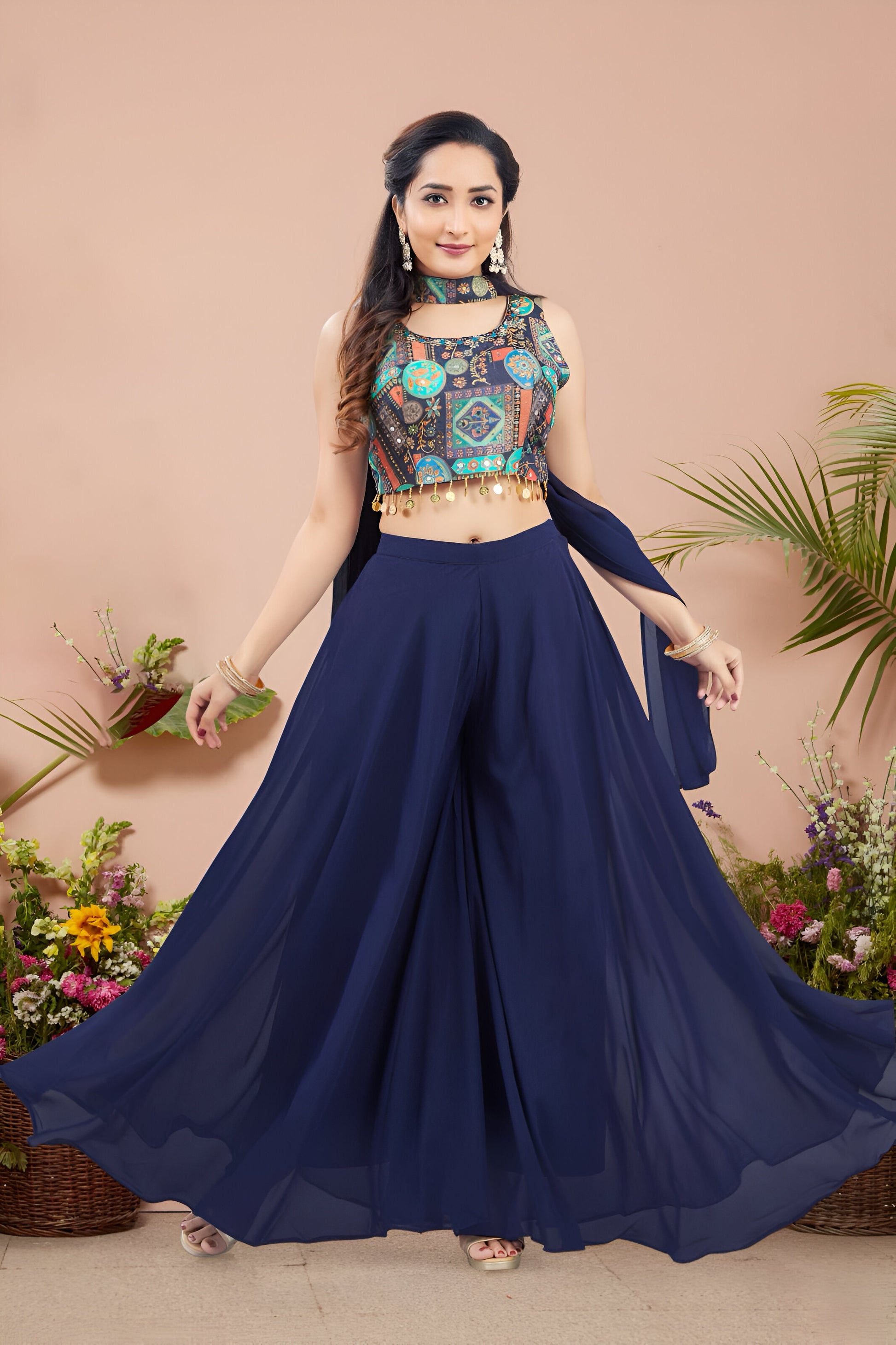 - Indian style outfit consisting of a printed cropped top, wide-leg pants, and dupatta.